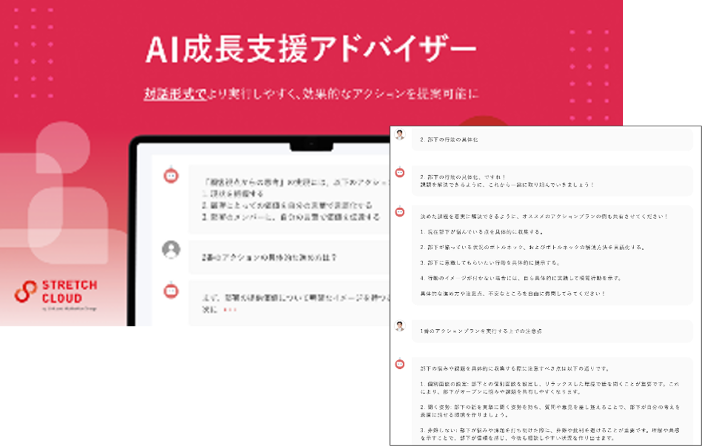 改善施策の設定支援としてAIによるサポート機能が備わっています。チャットでの簡単なやり取りを行うと、約10万名のデータから導かれるおすすめの改善施策をAIが提示します。