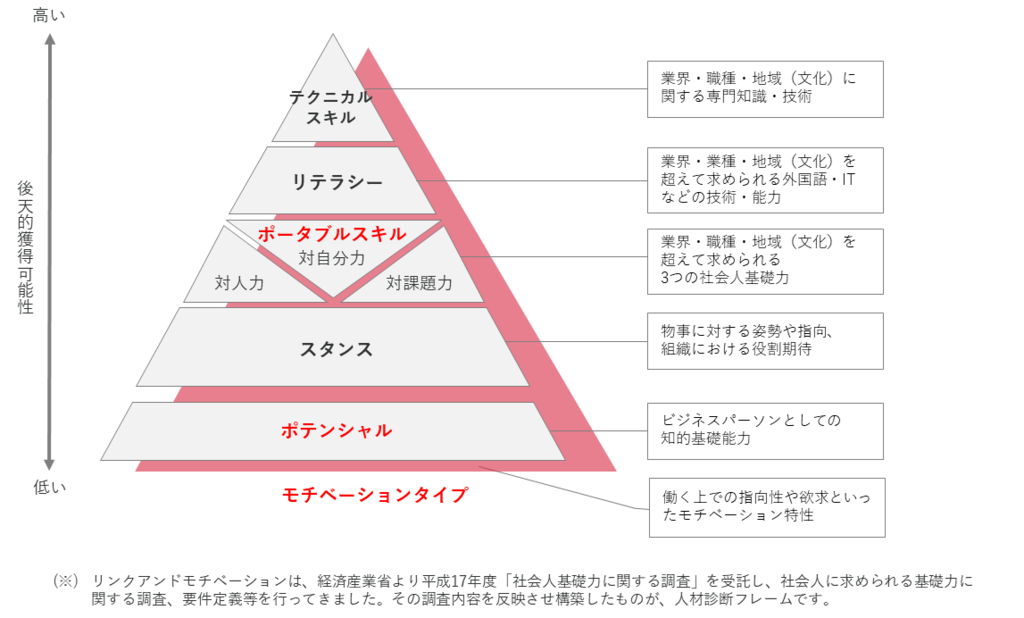 社会人基礎力は、課題発見能力やコミュニケーション能力など、業界や職種問わず普遍的に求められる、どの仕事にも持ち運び可能な”ポータブルスキル”と捉えることもできます。