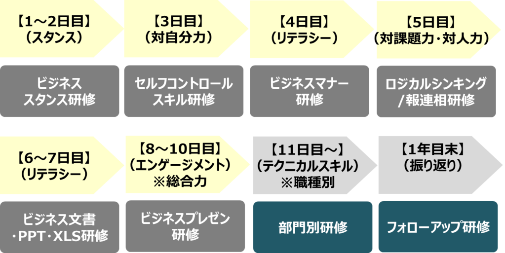 企業(人事・総務部)は、新人が早期に成果を出せるように教育サポートをしつつ、社会人としての中長期的に成長をし続けられる土台を整えるためのカリキュラムを作ることが求められます。