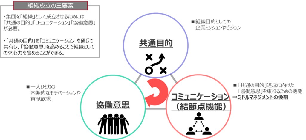 事業とメンバー、そしてマネジメントを繋げて考える際のフレームとしては社会学者のチェスターバーナードが提唱した「組織成立の三要素」が役に立ちます。