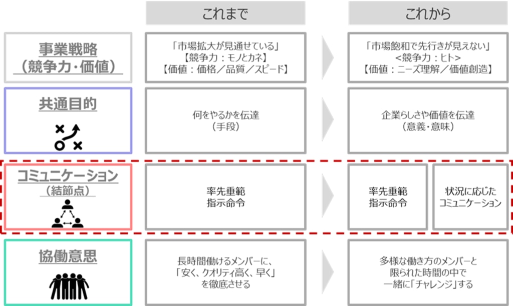 管理職の方々は日々現場を支えているだけではなく、会社の方針や戦略を現場で実践させるための大事な機能を担っているからこそ、変化を求める際には理由と到達すべきゴールを明示することが重要です。