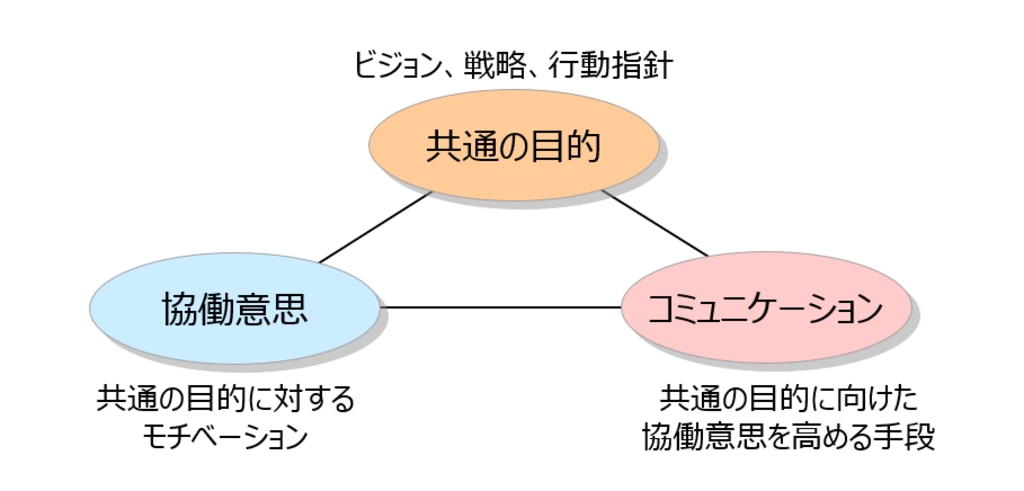 これら共通の目的、協働意思、コミュニケーションの3つの要素をバラバラに強化するのではなく、 「食い違っていないか?」「部署によってバラついていないか?」など、それぞれの繋がりを考えることで企業運営がスムーズに進んでいきます。