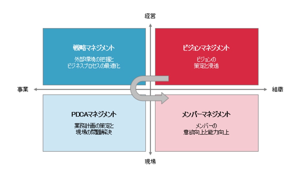 「結節点」とは「経営と現場」「自部署と他部署」の間をコミュニケーションによって繋ぎ、ビジョンの現場における実現度合いを高める役割です。 「結節点」を更に砕くと、マネジメントには4つのステップに整理できます。ビジョンマネジメント、戦略マネジメント、PDCAマネジメント、メンバーマネジメントです。