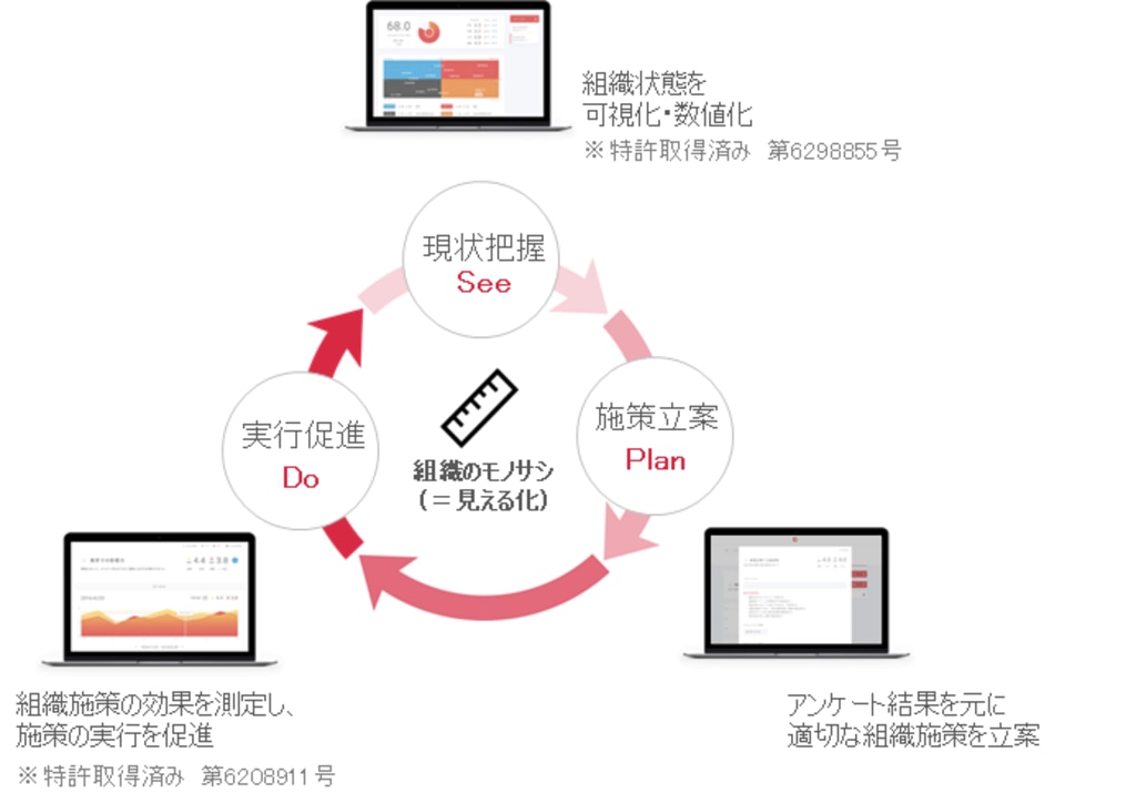 組織状態を把握した上で、例えば事業成長などの目的の達成に向けて、組織改善のためのPDCAサイクルへつなげていくことが重要です。