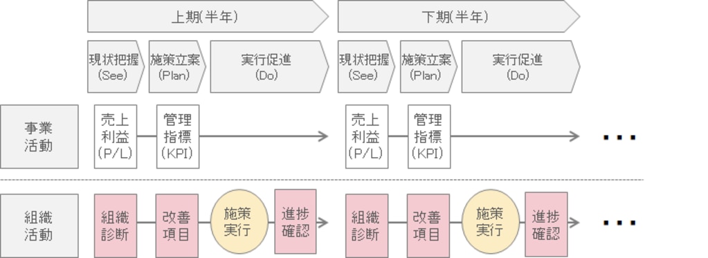 陥りがちな状態としては、1~3年に1回の診断しかせず、事業環境や組織環境の変化に応じたPDCAサイクルが回らない状態です。半年や四半期の事業活動のサイクルと同様に組織活動のサイクルも回していくことが重要です。