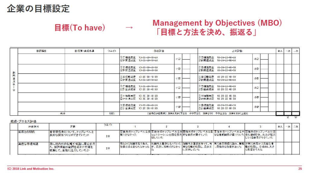 本来、ドラッカー氏が提唱したMBO(Management By Objectives and Self-control)とは、社員自らが自分で目標を決めて取り組むことで社員のモチベーションアップを促し、それを企業の成果につなげるマネジメント手法であり、評価のための手法ではありませんでした。