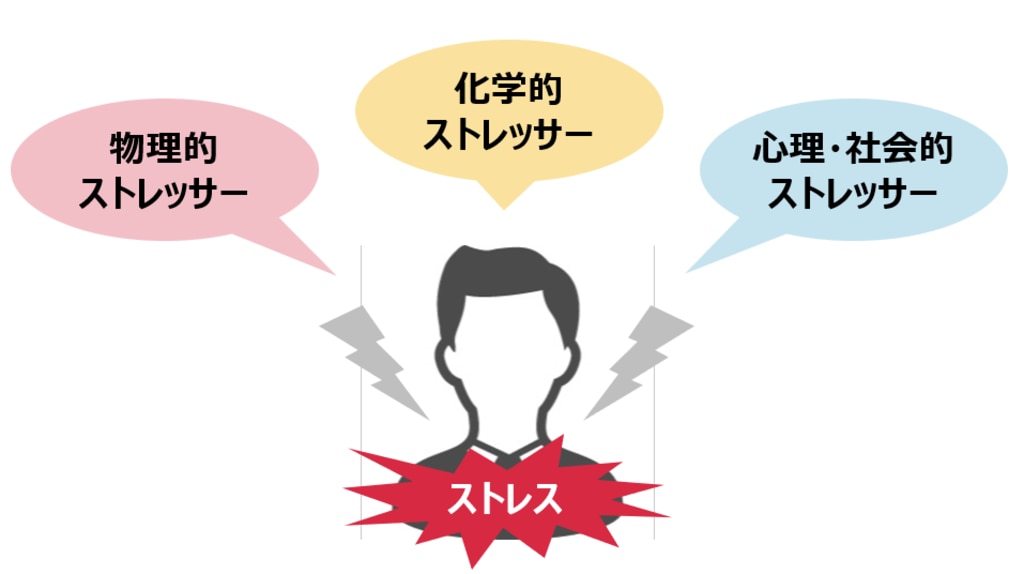 ストレスの原因となるストレッサーには大きく分けて「物理的ストレッサー」「化学的ストレッサー」「心理・社会的ストレッサー」の3種類があります。