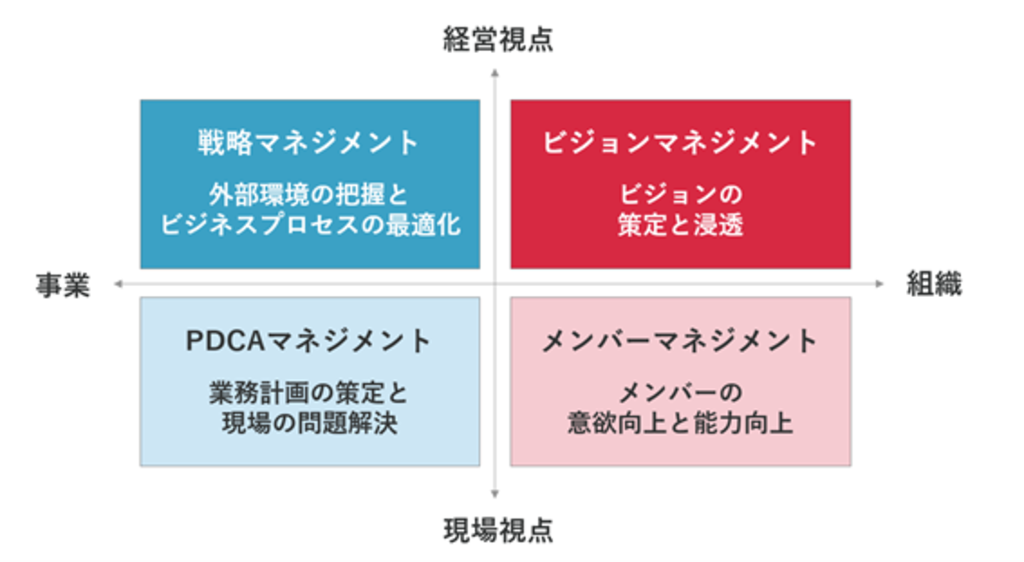 マネジャーは、経営視点と現場視点・事業と組織の4象限のマトリクスを意識しながら、以下の図にあるような4つのマネジメントを同時並行で行う必要があります。