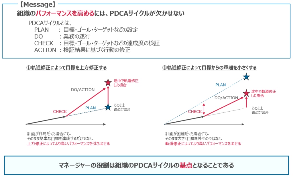 PDCAをさらに効果的にするために最も重要なのはCheckです。特に新規入社者への「フォローアップ」を主な目的として進める場合は、マネージャーは適切にPlanで立てた目標・ゴール・ターゲットを上方修正、または乖離をなくすために軌道修正を行う支援が出来ると良いでしょう。