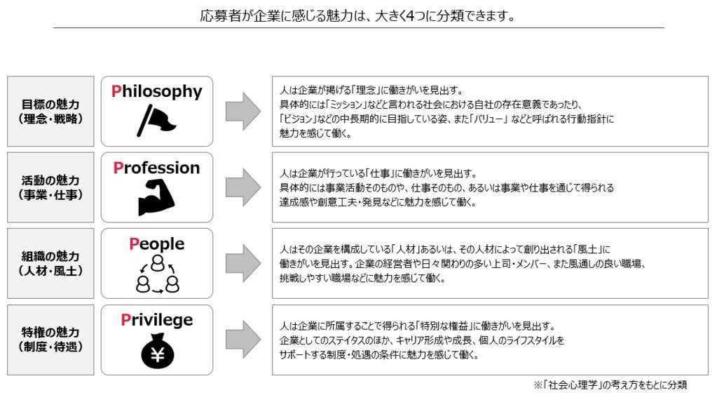 また、応募者が欲しているものを理解するためのフレームワークとしても先ほどご紹介した社会心理学の「4つのP」を活用できると良いでしょう。