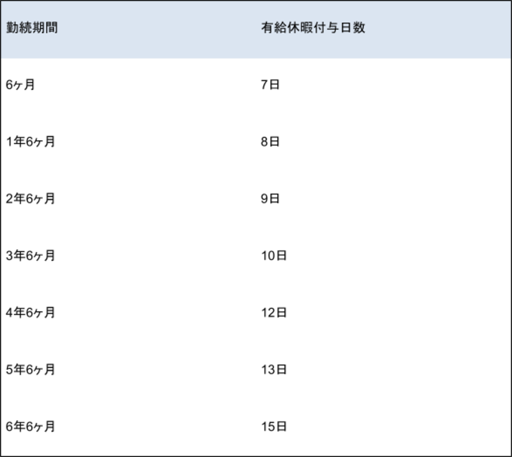 フルタイムで働く従業員の場合、入社してから6ヶ月以上勤続し、その6ヶ月の全労働日の8割以上を出勤していれば、10日の年次有給休暇を付与する必要があります。また、以下のとおり、勤続期間に比例して付与すべき年次有給休暇の日数は増加していきます。