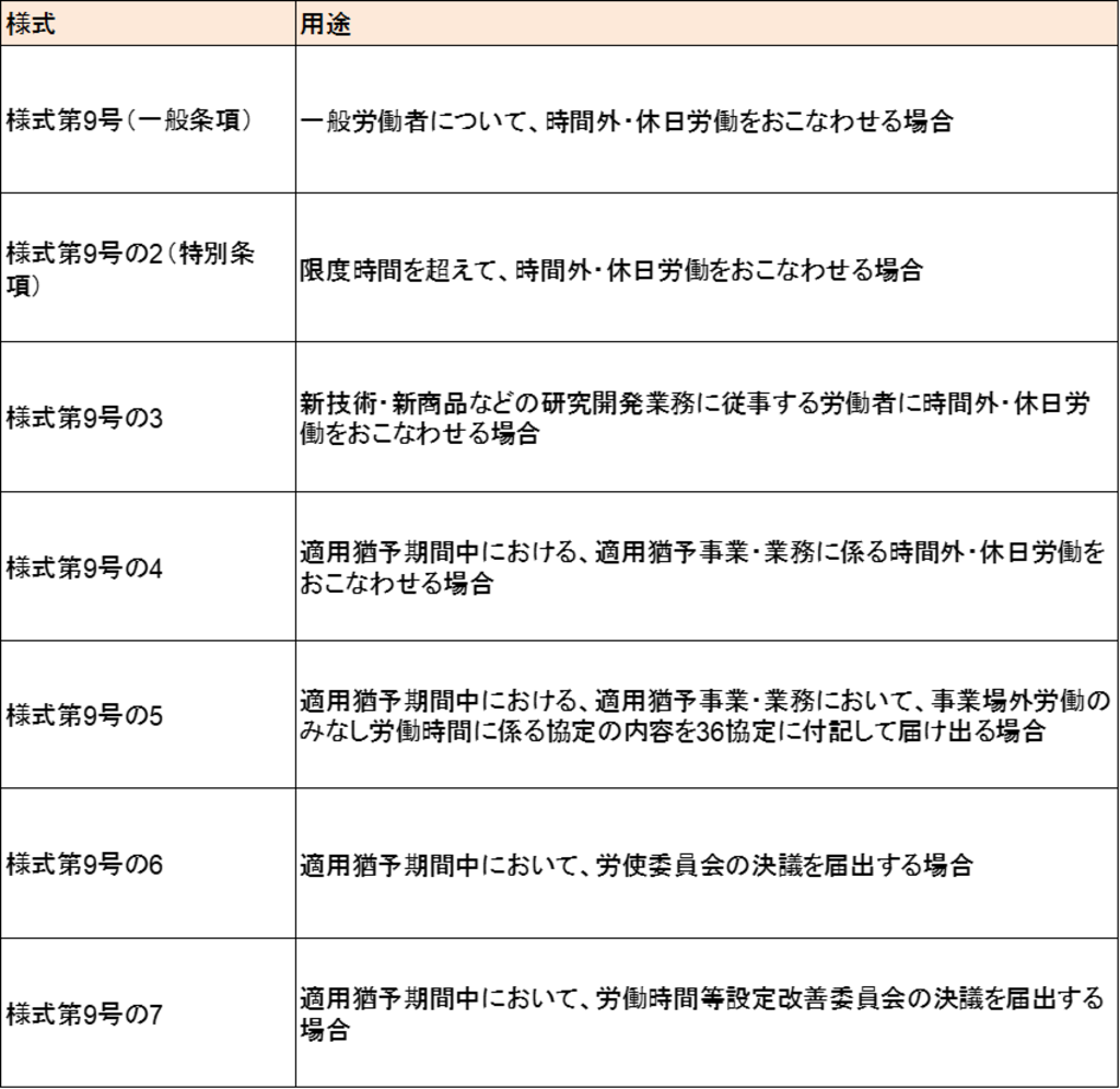 労働基準法の改正によって時間外労働の上限が規定されたことで、36協定で定める必要がある事項も変更されました。そのため、36協定届(時間外労働・休日労働に関する協定届)も新しい様式になりました。新しい36協定届は、以下のとおり、用途に応じた7種の様式が用意されています。