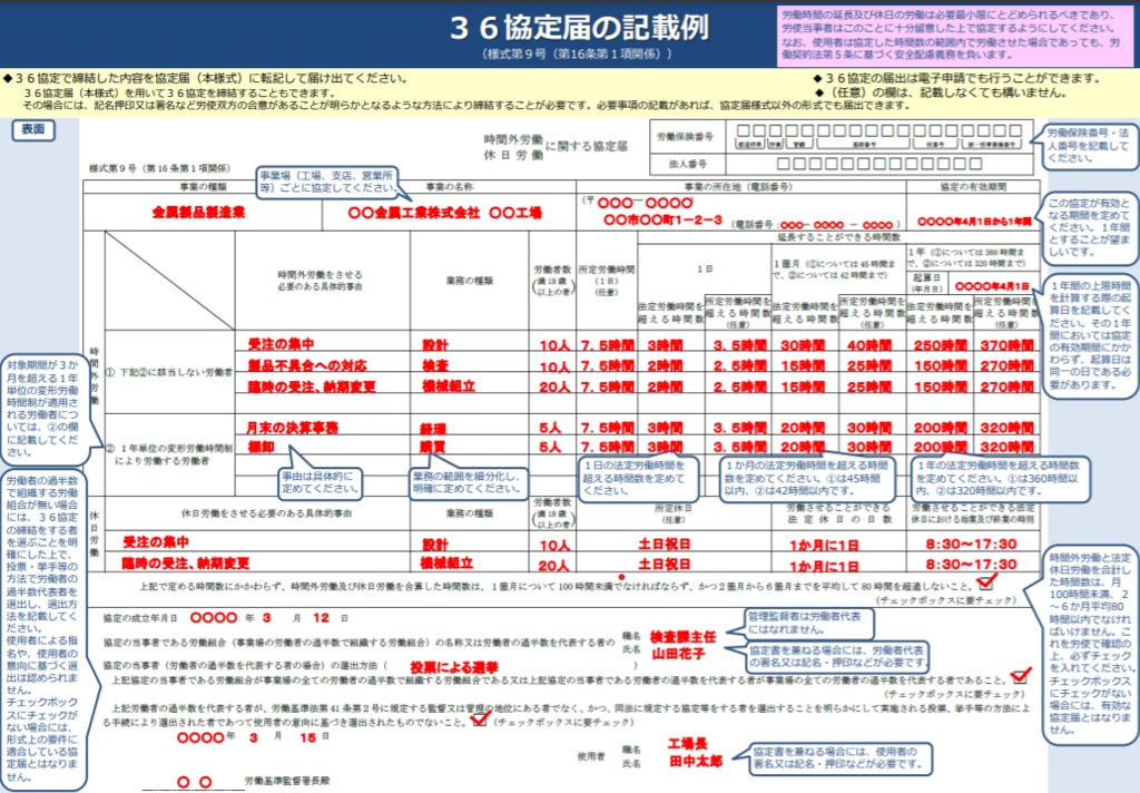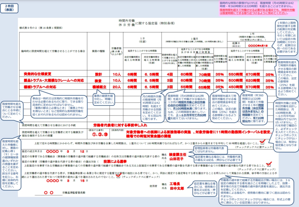 下記の記載例を参考に36協定の案を作成します。時間外労働が月45時間・年360時間以内の場合は様式第9号を、時間外労働が月45時間・年360時間を超える場合は様式第9号の2を作成します。