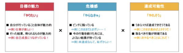 モチベーションの高さは、「目標の魅力」と「危機感」、「達成可能性」で構成されます。「やりたい」と思うためには、数値だけではなく「何のためにやるのか」といった目的まで考えます。また、「やらなきゃ」と思うために、「できなかった場合どうなるか」や「いつまでにやるか」といったことを考え、決めておきます。そして、「やれそう」と思うためには無理な目標ではなく、ある程度現実的なものを設定します。
