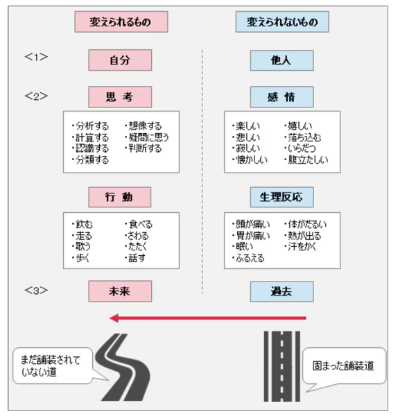 セルフコントロール能力を高める上で、「変えられることだけにエネルギーを注ぐ」ことが大切です。私たちは普段、「変えられない」と分かっているはずのことに、多大なエネルギーや労力を費やしている場合が多く見られるのではないでしょうか。「変えられるもの」に関しては以下3つの観点があります。