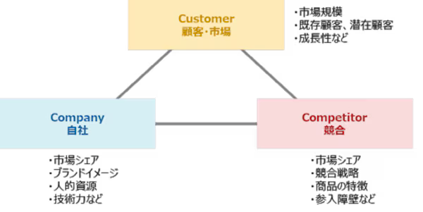 3C分析は、ビジネスの3つの主要な要素である「Company(企業)」、「Customer(顧客)」、「Competitor(競合)」を評価するフレームワークです。