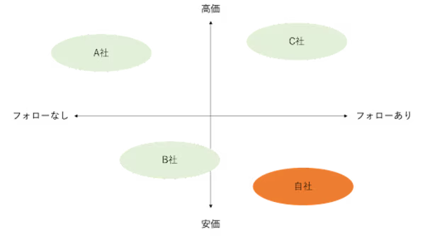 このフレームワークは、一般的には製品やブランドについて考える際に用いられますが、業界でのポジショニングなどを把握することへも活用することができます。