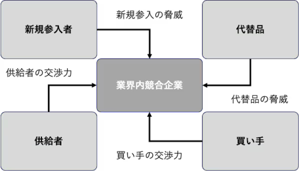 マイケル・ポーターが提唱した5フォース分析は、業界の競争構造を評価するフレームワークです。5つのフォースとは、「業界内の競争」、「新規参入の脅威」、「代替品の脅威」、「買い手の交渉力」、「売り手の交渉力」です。