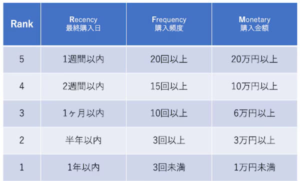 RFM分析は、顧客の購買行動を「Recency(最新の購入からの経過日数)」、「Frequency(購入頻度)」、「Monetary(購入金額)」の3つの指標で評価するフレームワークです。