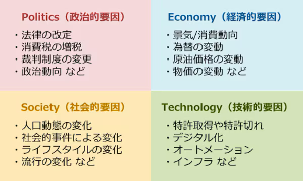 PEST分析は、外部環境を「Political(政治的要因)」、「Economic(経済的要因)」、「Social(社会的要因)」、「Technological(技術的要因)」の4つのカテゴリで評価するフレームワークです。