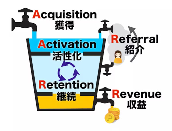 獲得は新しいユーザーをどのようにして取得するか、活性化はユーザーが製品やサービスを初めて使う経験、維持はユーザーをどのように維持するか、紹介はユーザーが他の人々に製品やサービスを紹介するプロセス、収益は収入をどのように生成するかを示しています。
