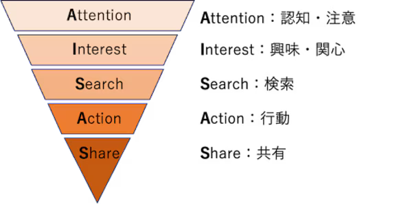 従来のAIDMAモデルに比べて、消費者が情報を積極的に検索する「Search」や、購入後の経験を他者と共有する「Share」のステップが追加されています。このモデルは、特にオンラインマーケティングの戦略策定に役立ちます。