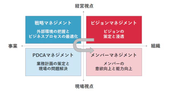 上記を実現するためにも管理職は経営と現場の結節点として、事業と組織の目指す姿と現場の業務やメンバーを繋ぐことが大切です。具体的には以下の4つの領域をマネジメントすることが求められます。