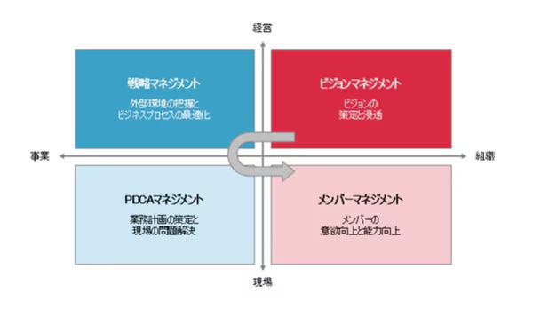 図の右上、ビジョンマネジメントとは、現場にビジョンを提示するマネジメントです。なぜ自社で働いているのか、この部署の存在意義は何かを現場に伝えていきます。