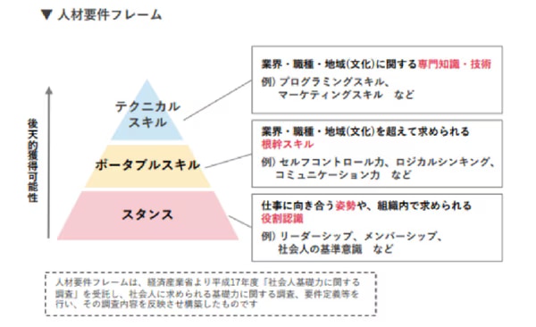 当社の研修設計のベースには、「人材要件フレーム」という考え方があります。人材要件フレームとは、社会人に求められ力を「スタンス・ポータブルスキル・テクニカルスキル」の3段階に分けたものです。