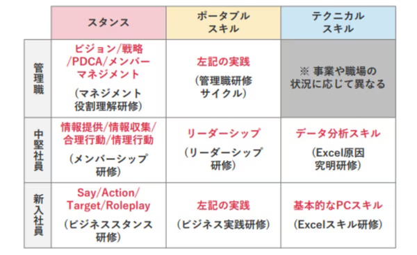 階層ごとに求められるスタンス・ポータブルスキル・テクニカルスキルは異なるため、下記のようにそれぞれに合わせて育むことが大切であるとし研修を設計しています。