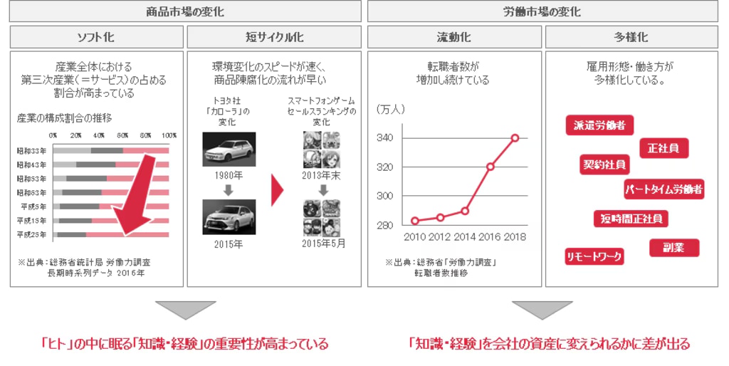 ここに終身雇用制度の事実上の廃止、中途採用市場の活性化という労働市場における「流動化」という波を受け、「ヒト」の中に眠る「知識や経験」の流出が問題となってきたのです。