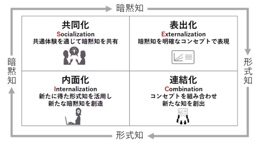 これは暗黙知と形式知の相互変換によって、知識を創造・展開する理論であり、多くの企業がナレッジ共有の基盤として活用しています。