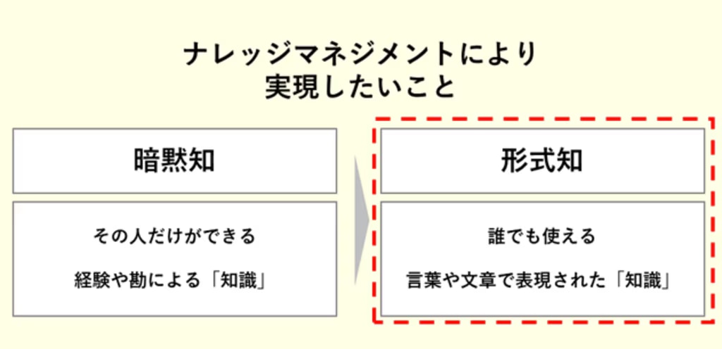 ナレッジマネジメントの考え方において重要な考えとして、「暗黙知」と「形式知」という知識の分類があります。「暗黙知」をいかに「形式知」に変えていけるかが鍵となります。