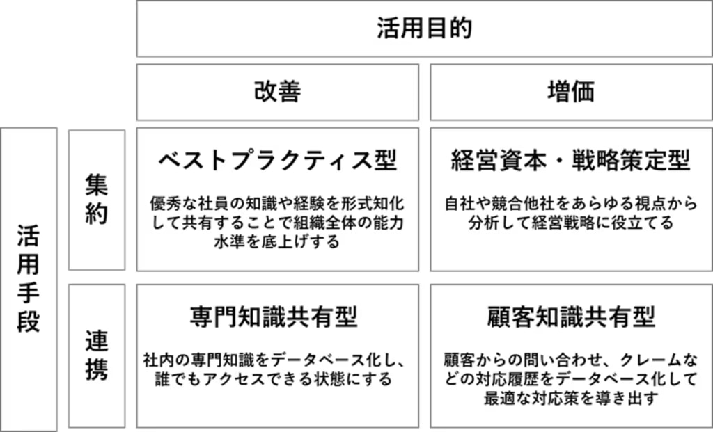 ナレッジマネジメントには4つの手法があり、活用目的と活用手段から整理をすることができます。