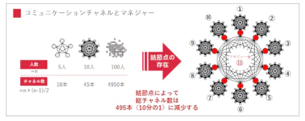 この考え方に立つと、組織が100人に拡大した場合、コミュニケーションチャネルは4950本となり、5人の組織に比べ、複雑性が495倍高まります。