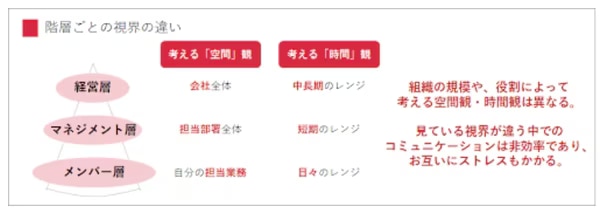 また、現場と経営層では下記の通り、日々考える視界が異なります。現場と経営を結節し組織の中のノイズを取り除いていくのがマネジメント層の役割であり、エンゲージメント向上に向けて重要なポジションと言えるでしょう。