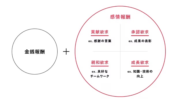 上記を前提にすると、会社へのエンゲージメントを高めるには、企業は「⾦銭報酬」に加えて「感情報酬」を提供することが重要になります。