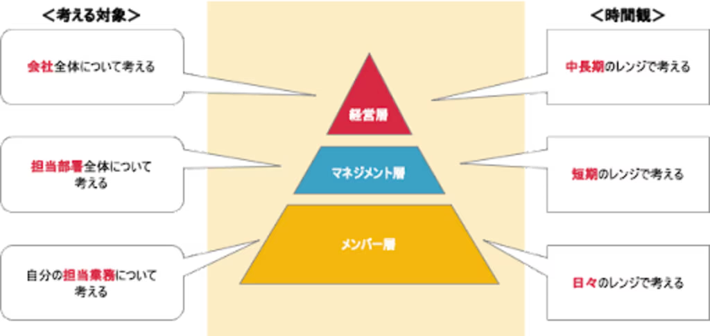 組織の中では立場によって見ている視界に下図のように「個別性」が生じることがよくあり、人によって「全社視点で長期的に考える人」と「個人視点で短期的に考える人」が出てくるため、それぞれの意見の食い違いが起こりやすくなります。
