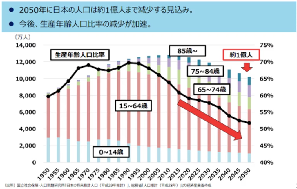 特に日本では少子高齢化の影響で労働人口の減少が問題視されています。経済産業省が公表している「2050年までの経済社会の構造変化と政策課題について」の中では、将来人口の予測として下図のように生産年齢人口比率は低下していくことが示唆されています。