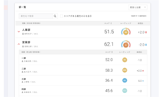 組織状態を分析して定めた改善項目に対してパルスサーベイを実施することで、アクションプランの効果を月次や週次といった短スパンで把握することができます。改善項目に絞ったサーベイ(回答所要時間 約1分)を実施した後は即時に、シンプルなデザインで結果表示。現場のマネジャーやメンバーでも、何をすれば良いか一目でわかります。