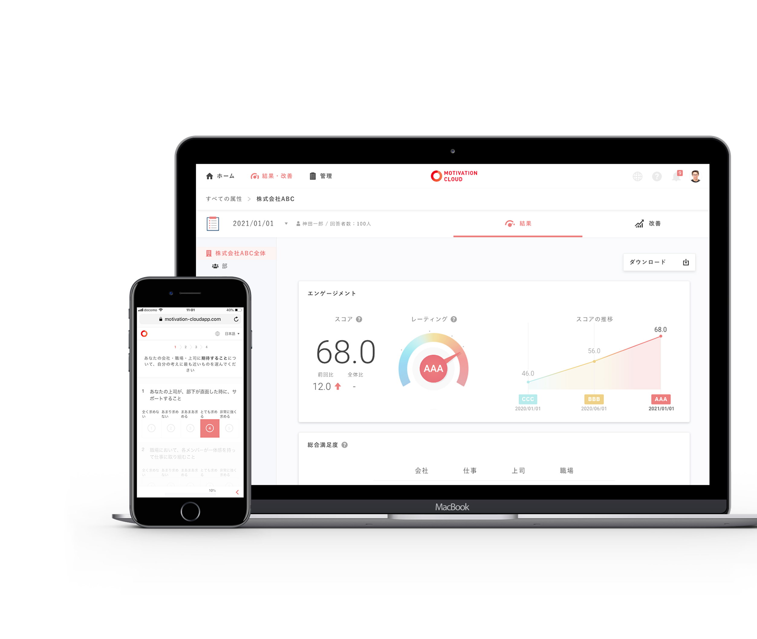モチベーションクラウドでは、20分程度の簡単なサーベイに回答するだけで従業員のエンゲージメント状態を可視化・数値化できます。13,460社、589万人の実績を誇る組織の統一指標「エンゲージメントスコア」と、期待度と満足度の2軸でのサーベイ調査により、抱えている組織課題が明確になります。