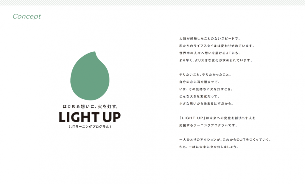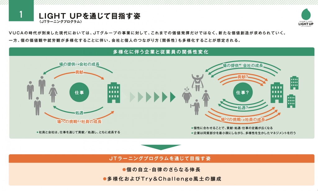 JT 藤村氏:今回、この成長支援体系には「LIGHT UP」という名前を付けています。込めた意味は、「変化へのきっかけづくり」「きっかけに火を灯す」です。このプログラムが自身の変化のきっかけづくりになったらいいなと強く思っています。