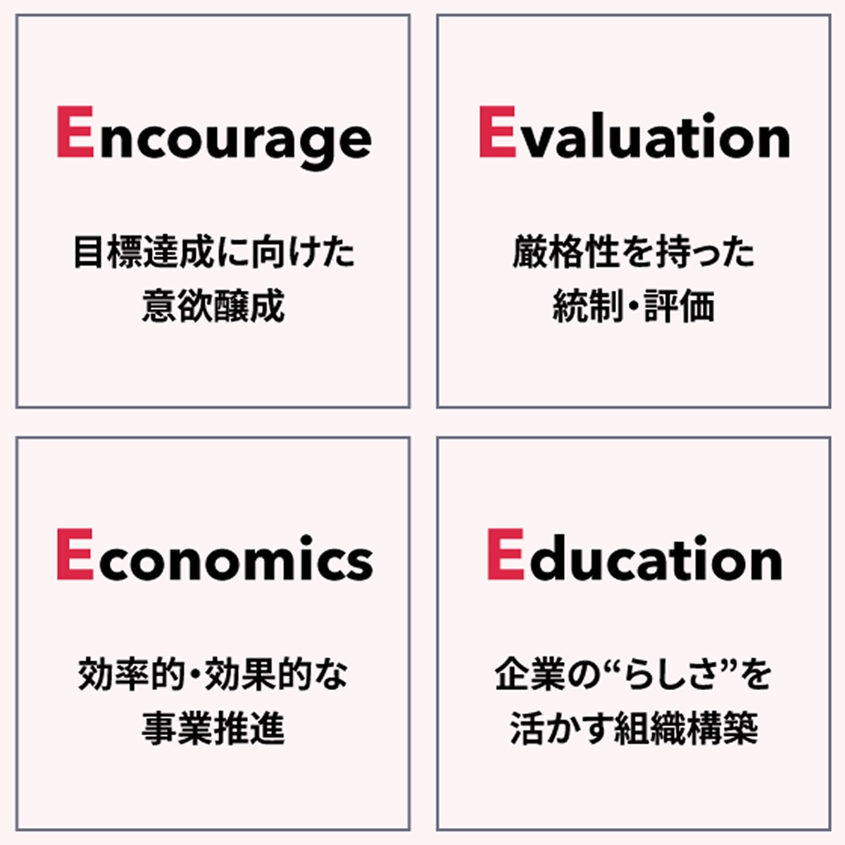 リンクアンドモチベーションでは、事業・組織を創る経営層に求められる役割・機能を、Encourage(目標達成に向けた意欲醸成)、Evaluation(厳格性を持った統制・評価)、Economics(効率的・効果的な事業促進)、Education(企業の”らしさ”を活かす組織構築)の「4つのE」で整理しています。サーベイでも「4つのE」をもとに能力を可視化しており、現状と課題が一目でわかるようになっています。