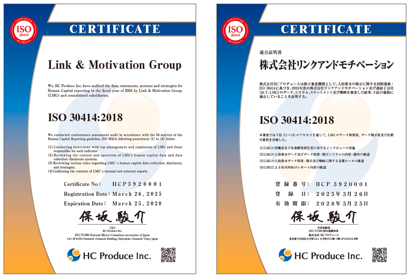 リンクアンドモチベーションは、ISO30414(人的資本に関する情報開示の国際的なガイドライン)の認証を、世界で5番目・日本で初めて取得しております。日本初の認証取得企業としての知見、独自技術「モチベーションエンジニアリング」などを活用しながら、開示のみならず人的資本経営全体のご支援も可能です。
