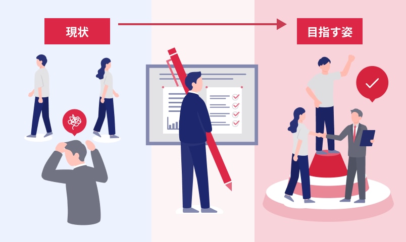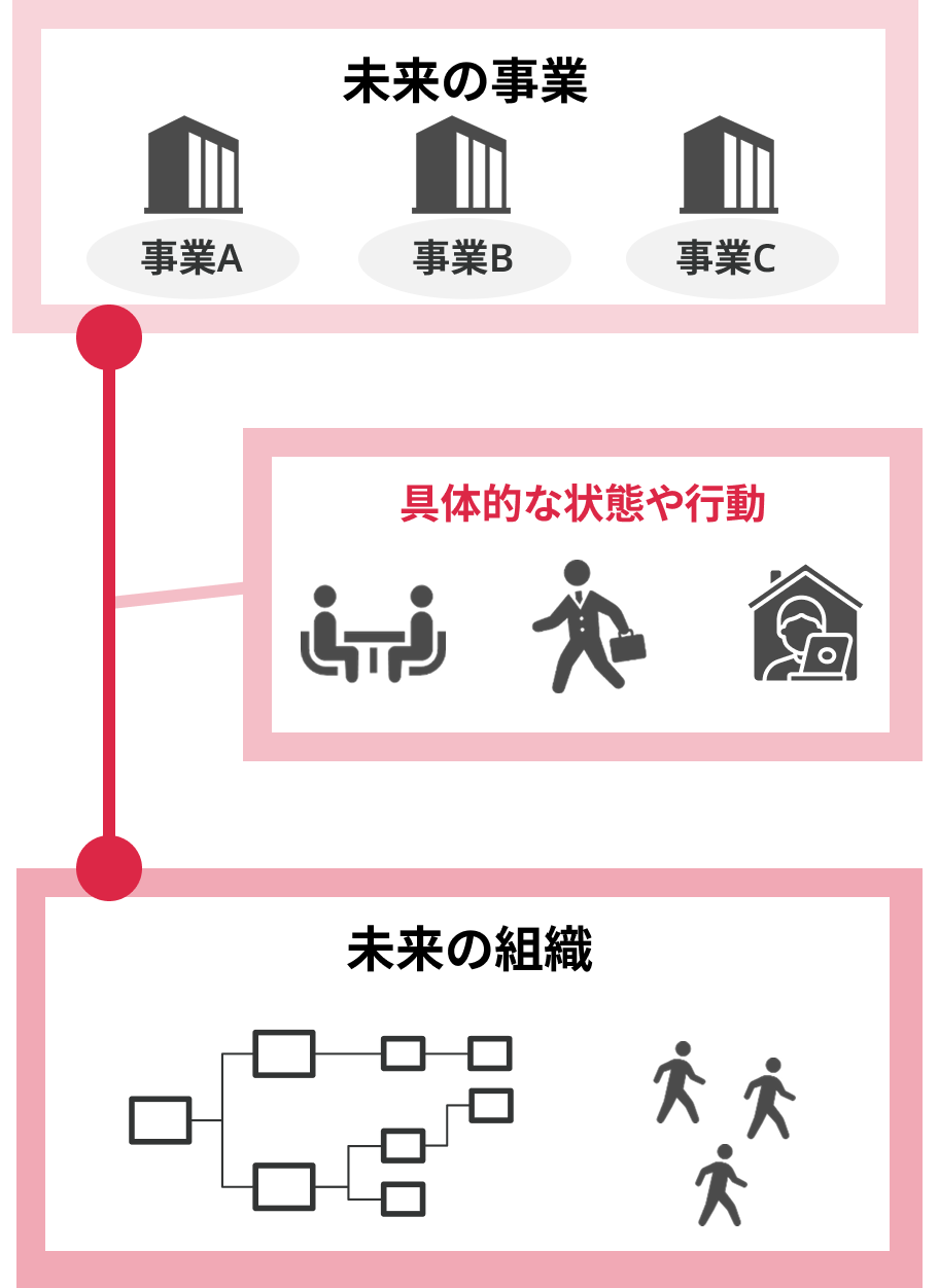 組織戦略が事業戦略と接続されていない中では、施策を進めても期待できる成果は得られません。リンクアンドモチベーションは、会社として目指したい事業に必要な状態や行動を具体的に言語化した上で、組織として目指す状態を定義します。事業戦略と組織戦略を接続することで、人的資本投資を意味あるものにします。