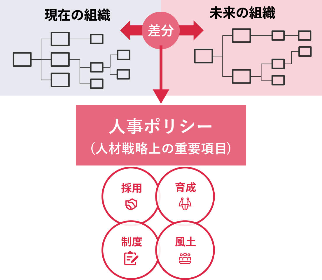 抽出した組織課題を分類し、組織の目指す姿に向けた組織人事ポリシーを定めます。
