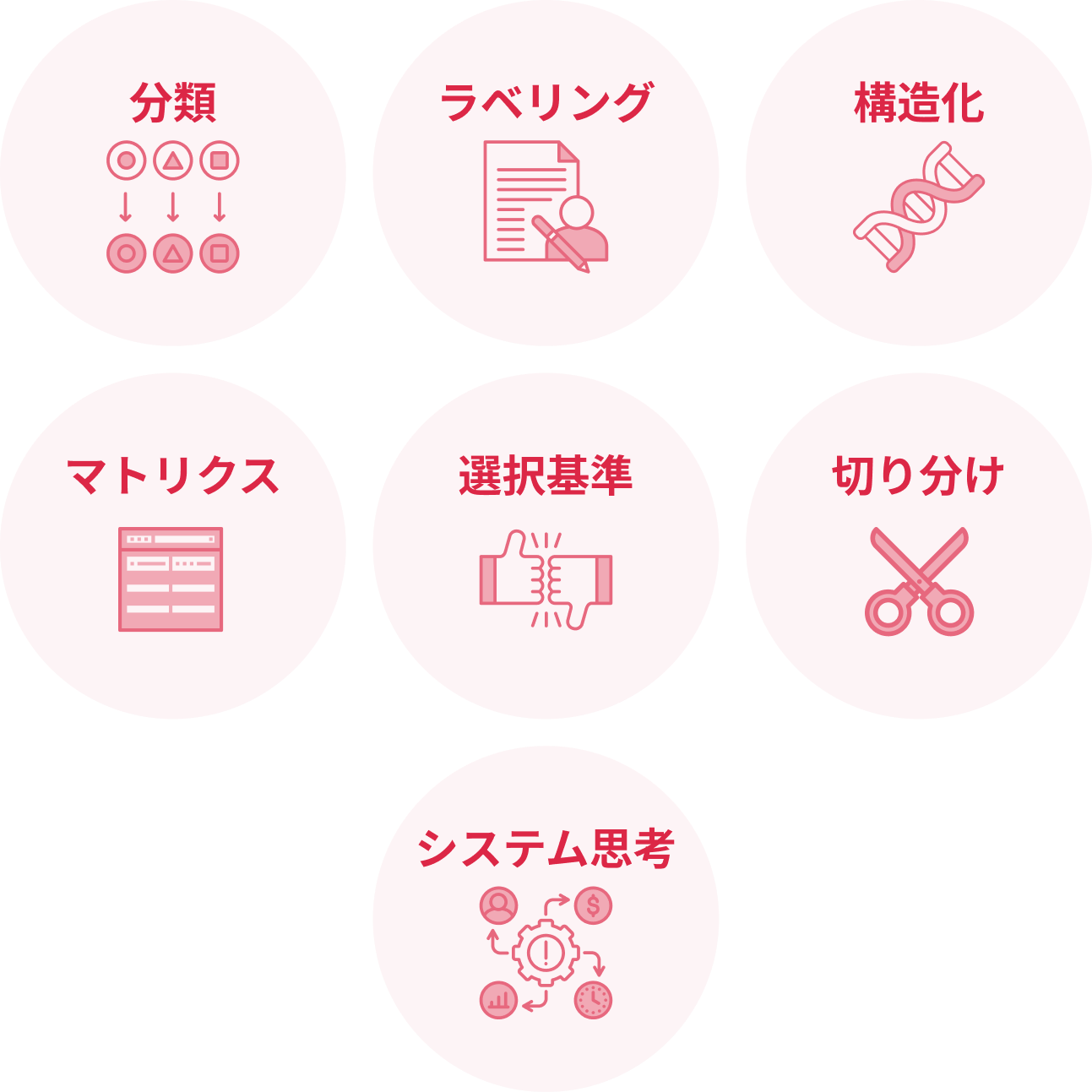 複雑かつ膨大な情報を、ポイントを押さえて整理し、意思決定や原因究明を行うまでの、ロジカルシンキングに必要な要素を「思考の7つ道具」として体系化して整理しております。