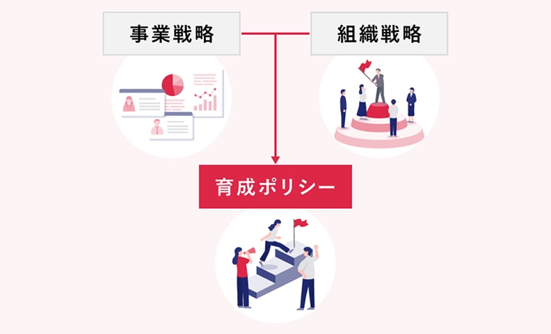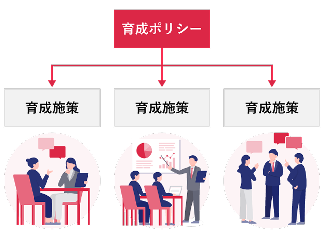 育成施策をはじめ、組織人事施策を設定しても、優先順位や実施方法設計の部分で挫折し形骸化してしまうケースは少なくないです。リンクアンドモチベーションでは、人材育成における重要項目として「育成ポリシー」を定めます。この育成ポリシーを軸に各施策のやるべき施策の優先順位と効果的な実施方法(時期や順序)を明確化することで、形骸化を防ぐことができます。また、施策同士を連動させて効果を最大化させることが可能です。