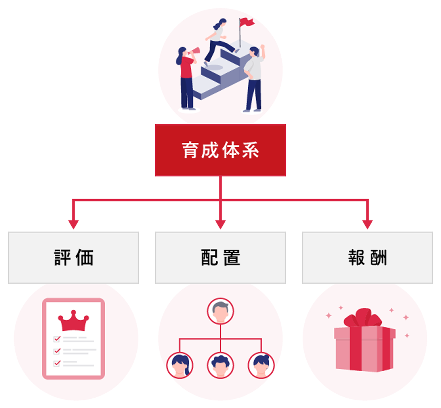 育成体系を設計するだけでなく、すでに設定されている評価や報酬などの人事制度や、各組織/各個人に設定されている配置・役割の設計とも連動させる形で、戦略的に育成体系を設計することが可能です。全体最適を目指した実効性の高い設計を実現します。